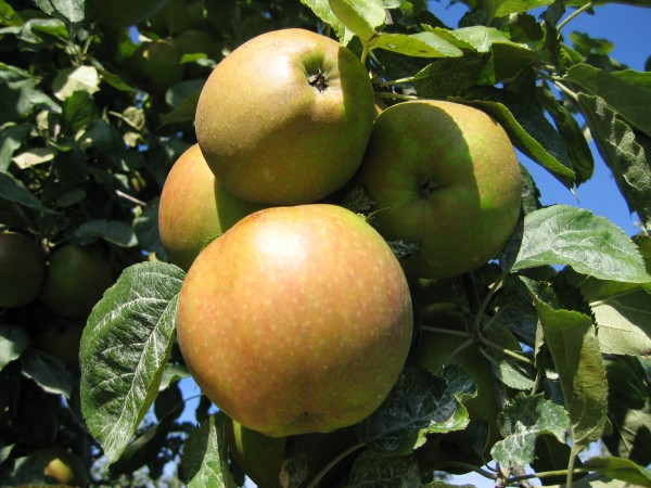 Aussehen: sehr starker Wuchs mit breit ausladender Krone, die Bäume benötigen viel Platz und lieben nahrhafte feuchte Böden. Der Boskoop gehört zu den frühblühenden Apfelsorten und ist deshalb frostgefährdet. Die Früchte sind meist groß, flachkugelig, die Schale ist netzartig berostet.