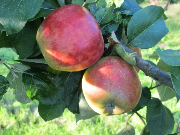 Aussehen:Die Bäume haben sehr weit ausladende Kronen, sie sind robust und wenig schorfempfindlich. Die Früchte sind von gelblicher Farbe, sonnenseits rötlich marmoriert, mit grünen Punkten übersät und rund.